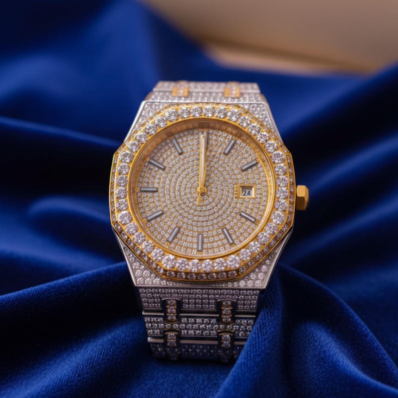 The elegant octagonal face is crafted with crystal-clear rhinestones, set meticulously to create a radiant shine. Its gold-tone body perfectly balances class and extravagance, making it the ultimate statement accessory for formal occasions, parties, or luxury streetwear.
